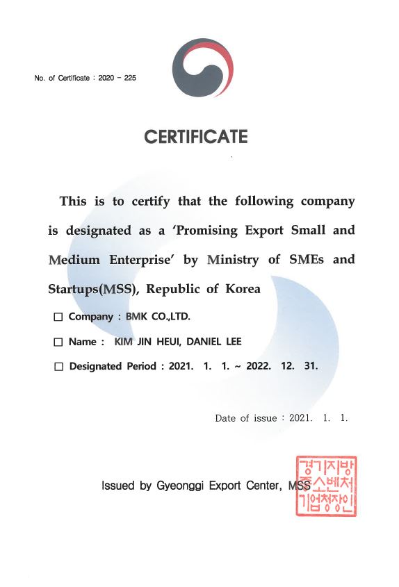 Promising Export Small and Medium Enterprise 페이지 정보 작성자 비엠케이 작성일21-01-22 10:56 조회3,082회 관련링크 이전글 다음글 목록 본문 'Promising Export Small and Medium Enterprise' by Ministry of SMEs and Startups(MSS), Republic of Korea 이전글 다음글 목록